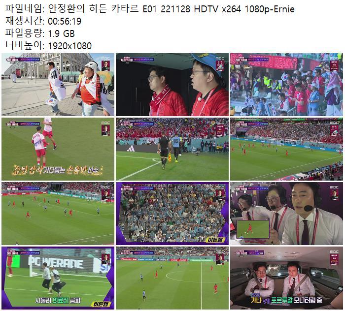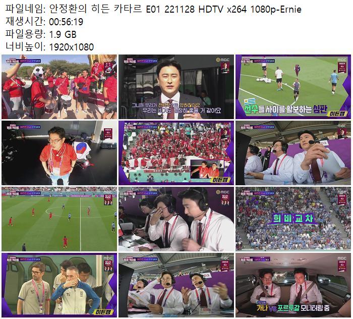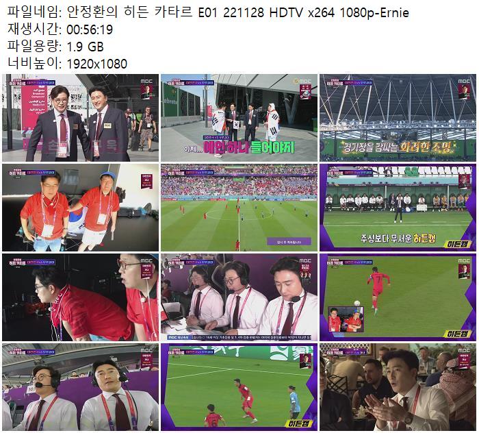 | 안정환의 히든 카타르 E01 221128 HDTV x264 1080p-Ernie.mkv | 1.9 G | 00:56:19 | 1920x1080 |