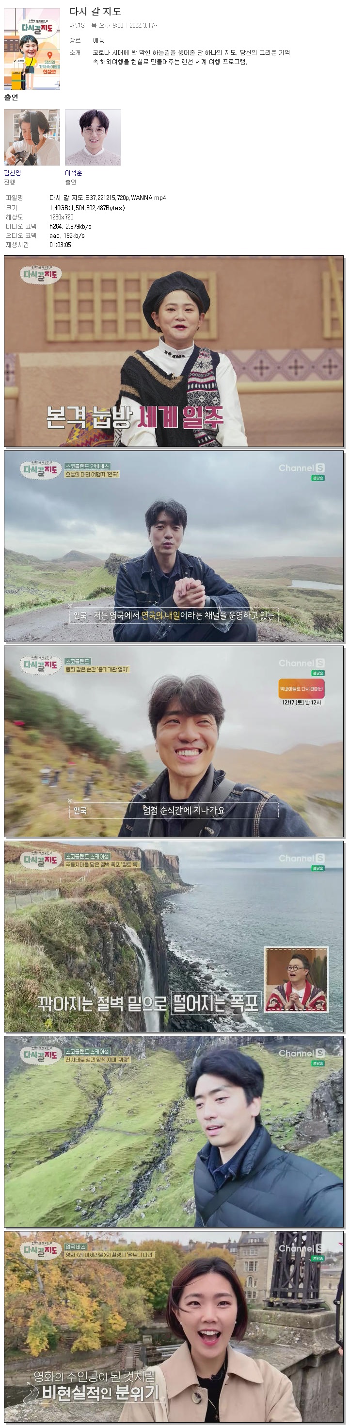 | 다시 갈 지도.E37.221215.720p.WANNA.mp4 | 1.4 G | 01:03:05 | 1280x720 |