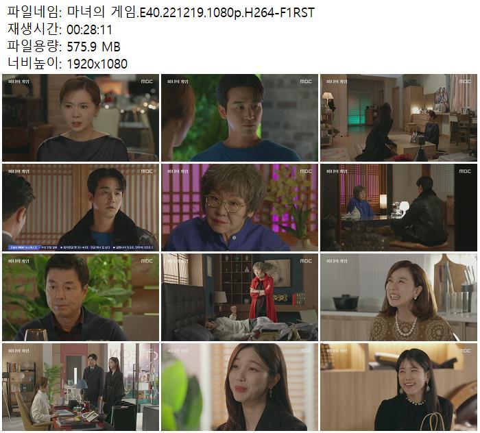 | 마녀의 게임.E40.221219.1080p.H264-F1RST.mp4 | 575.9 M | 00:28:11 | 1920x1080 |