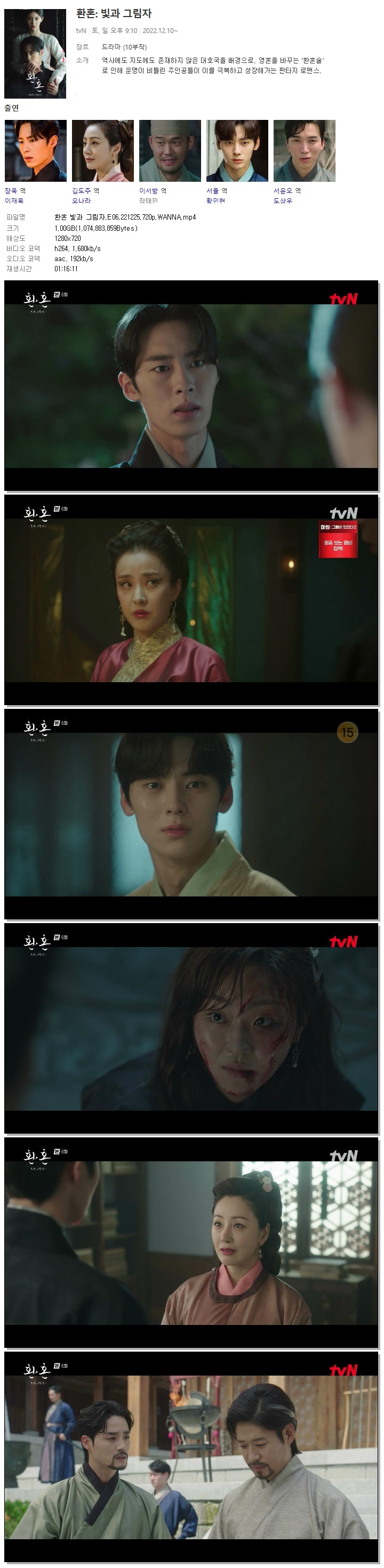 | 환혼 빛과 그림자.E06.221225.720p.WANNA.mp4 | 1 G | 01:16:11 | 1280x720 |