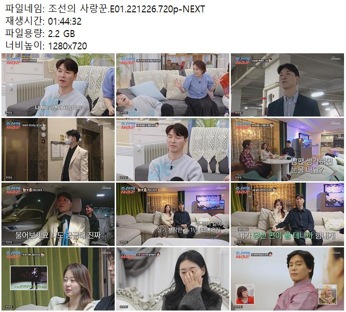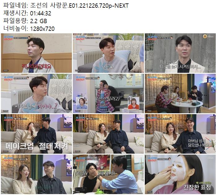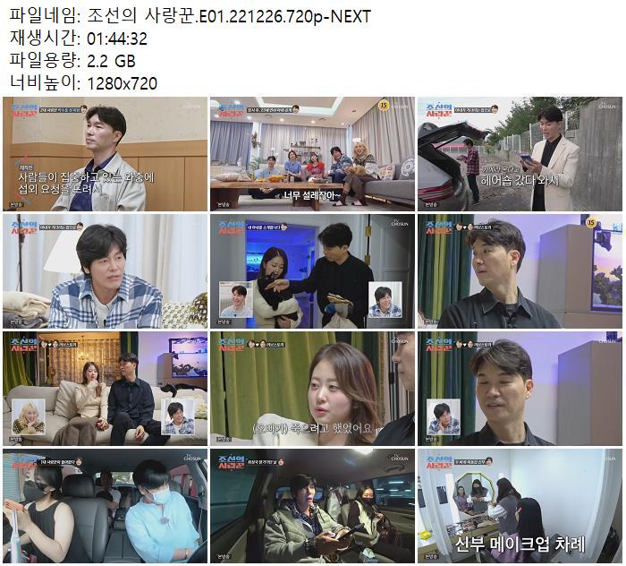 | 조선의 사랑꾼.E01.221226.720p-NEXT.mp4 | 2.2 G | 01:44:32 | 1280x720 |
