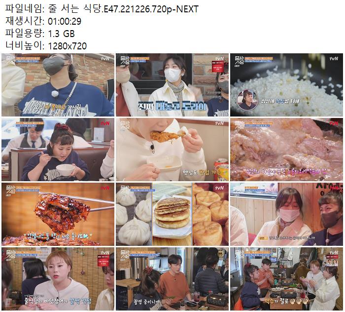 | 줄 서는 식당.E47.221226.720p-NEXT.mp4 | 1.3 G | 01:00:29 | 1280x720 |
