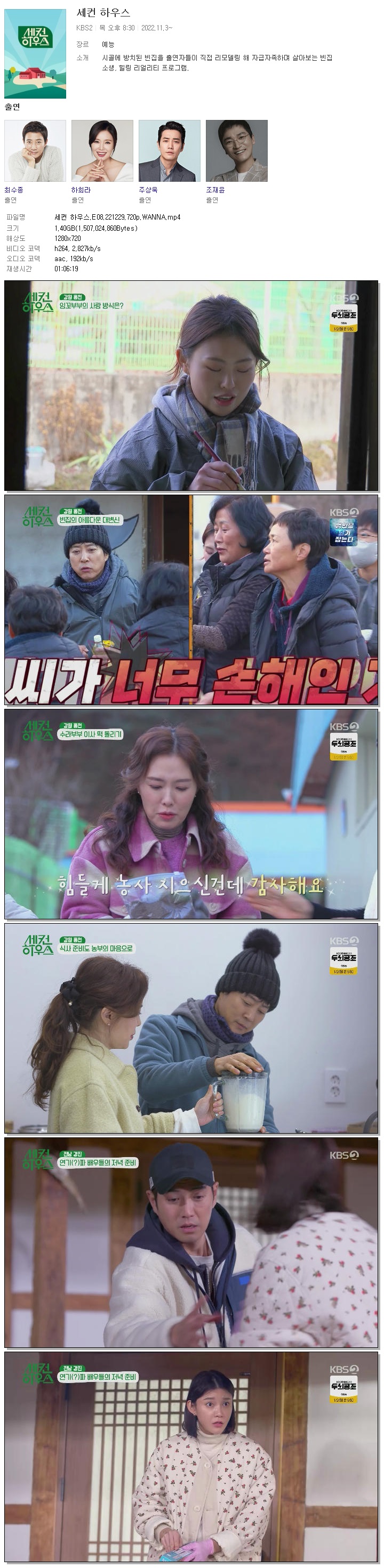 | 세컨 하우스.E08.221229.720p.WANNA.mp4 | 1.4 G | 01:06:19 | 1280x720 |