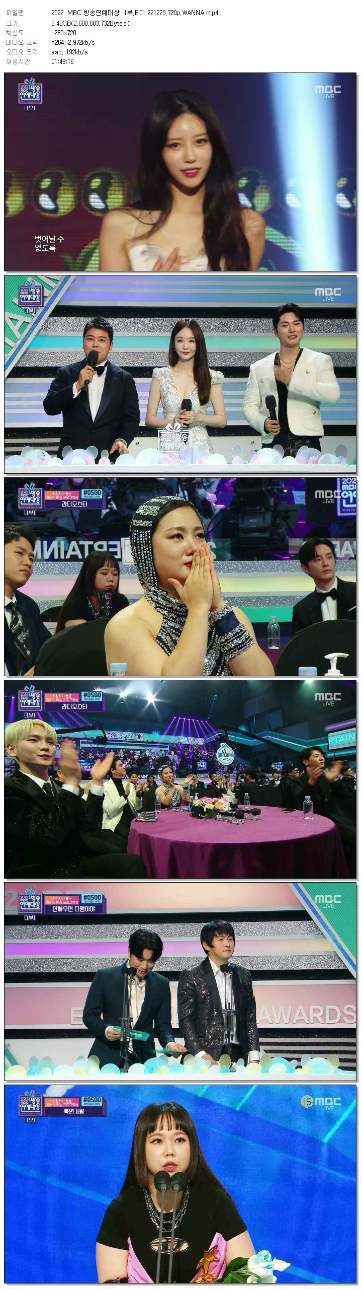 | 2022 MBC 방송연예대상 1부.E01.221229.720p.WANNA.mp4 | 2.4 G | 01:49:16 | 1280x720 |