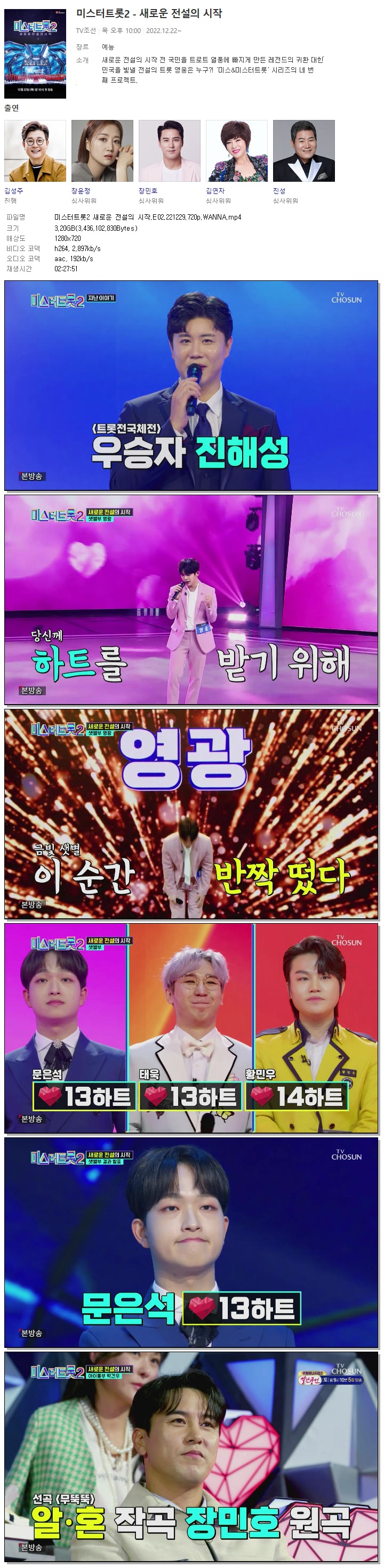 | 미스터트롯2 새로운 전설의 시작.E02.221229.720p.WANNA.mp4 | 3.2 G | 02:27:51 | 1280x720 |