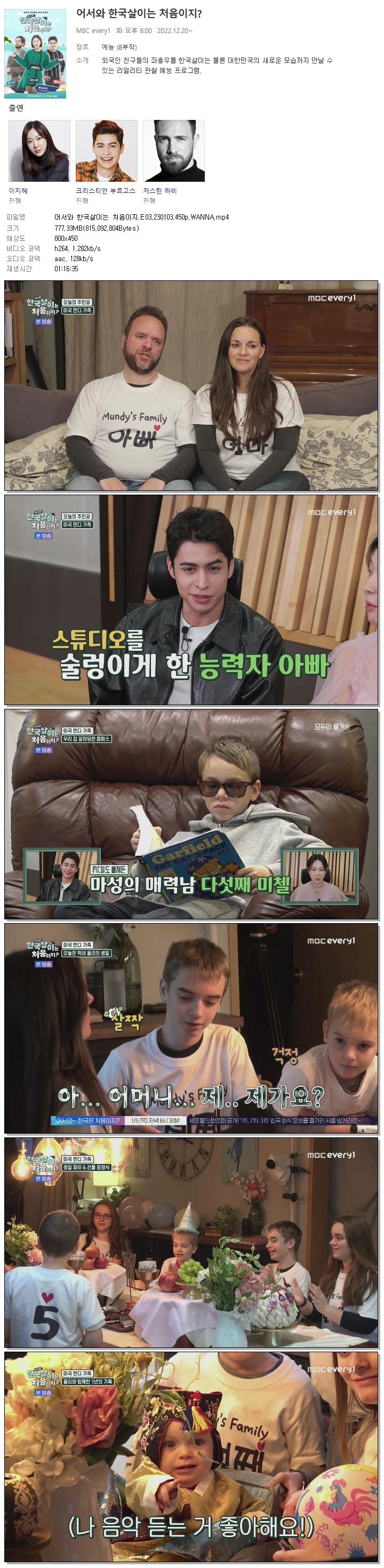 | 어서와 한국살이는 처음이지.E03.230103.450p.WANNA.mp4 | 777.3 M | 01:16:35 | 800x450 |