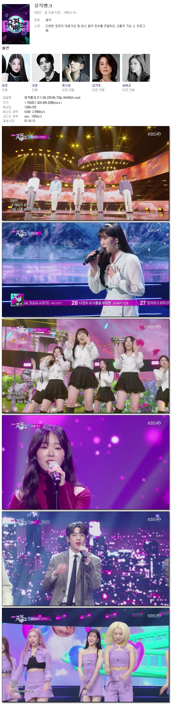 | 뮤직뱅크.E1149.230106.720p.WANNA.mp4 | 1.7 G | 01:16:13 | 1280x720 |