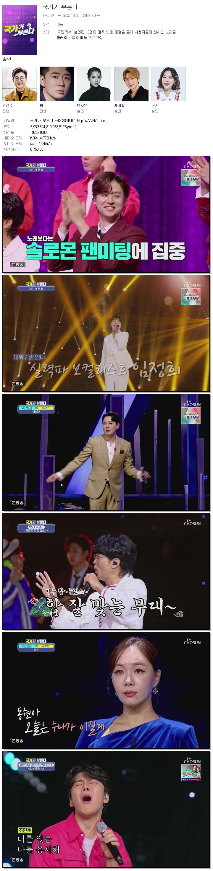 | 국가가 부른다.E42.230106.1080p.WANNA.mp4 | 3.9 G | 01:53:06 | 1920x1080 |
