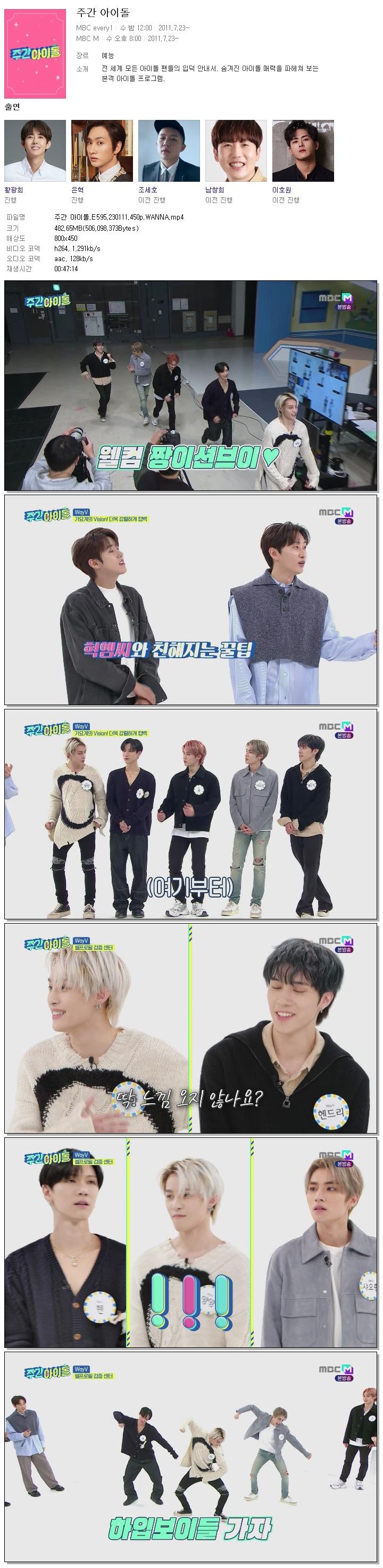 | 주간 아이돌.E595.230111.450p.WANNA.mp4 | 482.7 M | 00:47:14 | 800x450 |