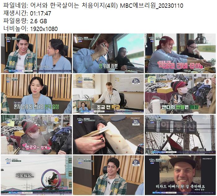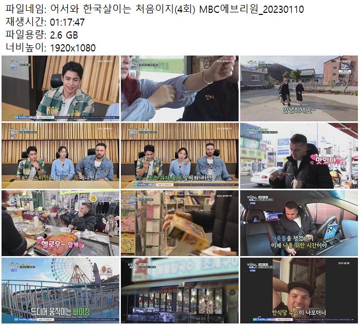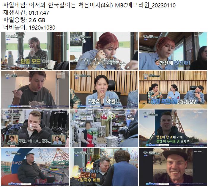 | 어서와 한국살이는 처음이지(4회) MBC에브리원_20230110.mp4 | 2.6 G | 01:17:47 | 1920x1080 |