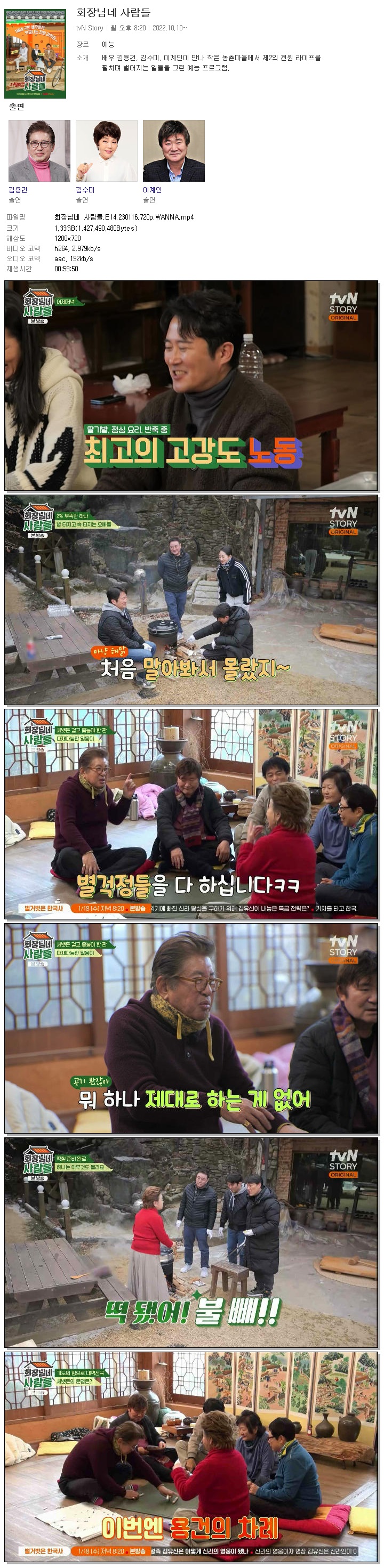 | 회장님네 사람들.E14.230116.720p.WANNA.mp4 | 1.3 G | 00:59:50 | 1280x720 |