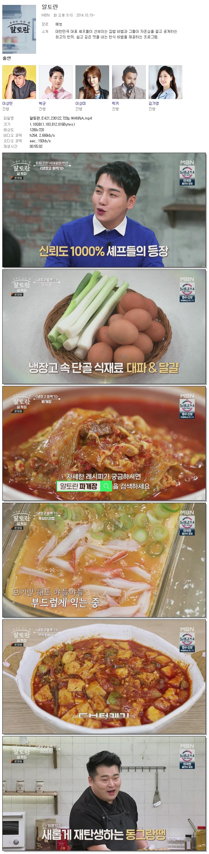 | 알토란.E421.230122.720p.WANNA.mp4 | 1.1 G | 00:55:02 | 1280x720 |