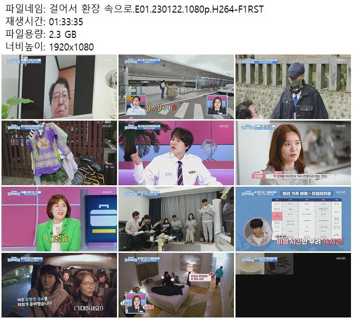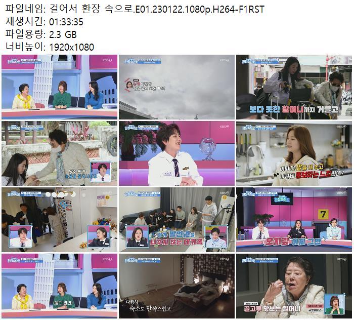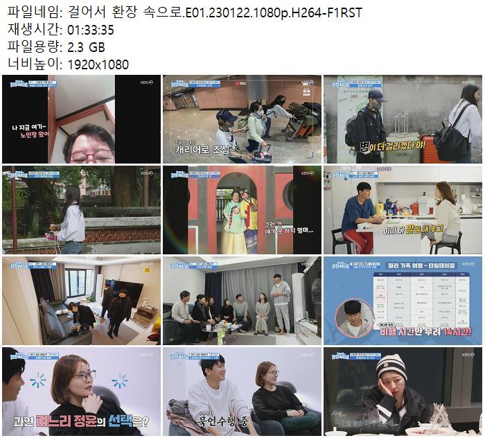 | 걸어서 환장 속으로.E01.230122.1080p.H264-F1RST.mp4 | 2.3 G | 01:33:35 | 1920x1080 |