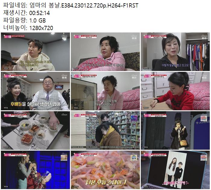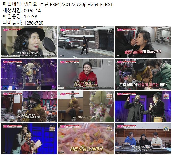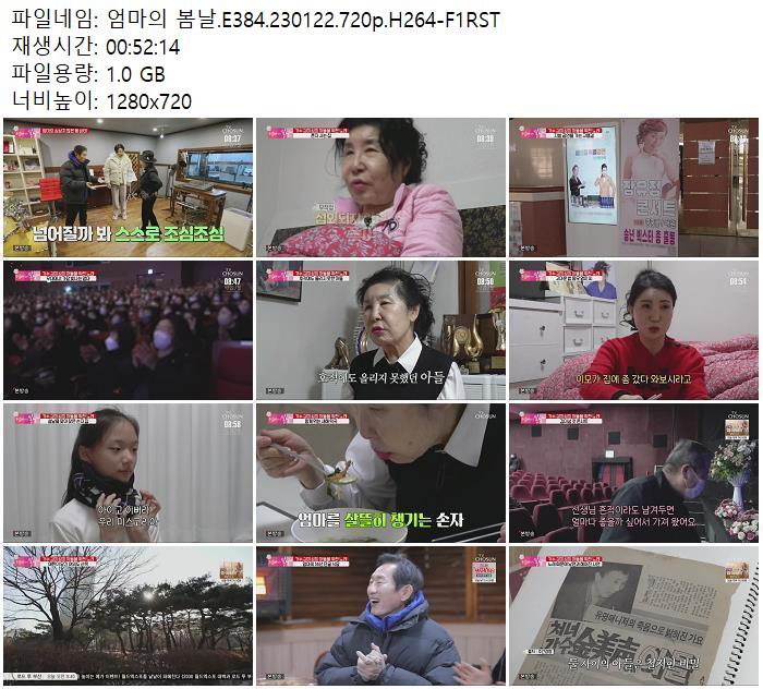 | 엄마의 봄날.E384.230122.720p.H264-F1RST.mp4 | 1 G | 00:52:14 | 1280x720 |