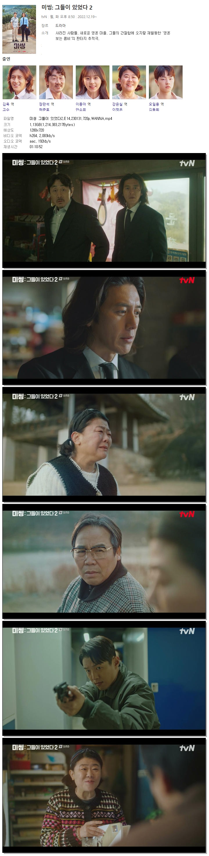 | 미씽 그들이 있었다2.E14.230131.720p.WANNA.mp4 | 1.1 G | 01:10:52 | 1280x720 |