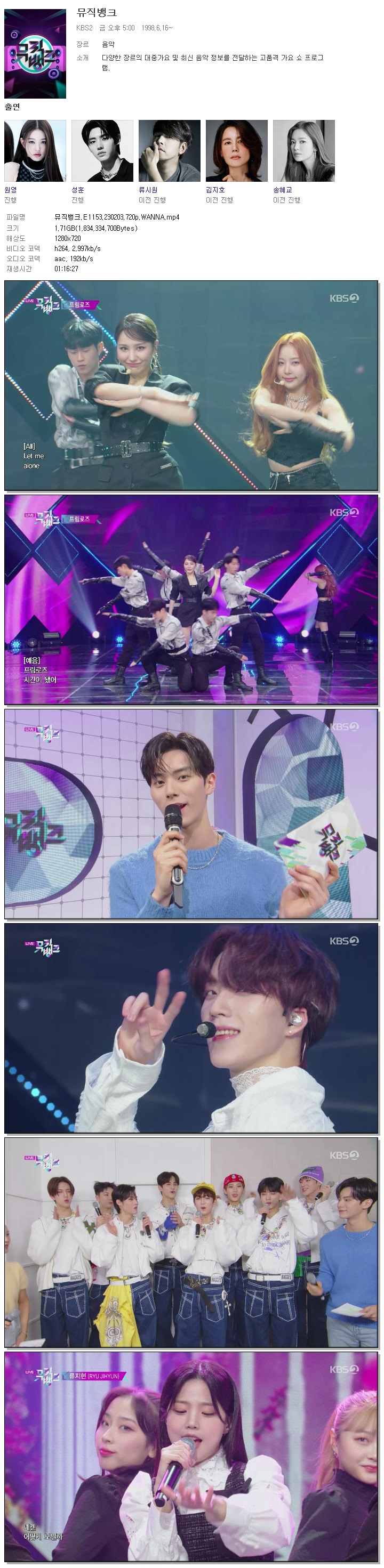 | 뮤직뱅크.E1153.230203.720p.WANNA.mp4 | 1.7 G | 01:16:27 | 1280x720 |