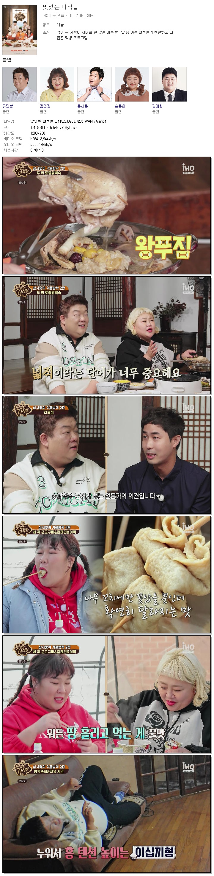 | 맛있는 녀석들.E415.230203.720p.WANNA.mp4 | 1.4 G | 01:04:13 | 1280x720 |