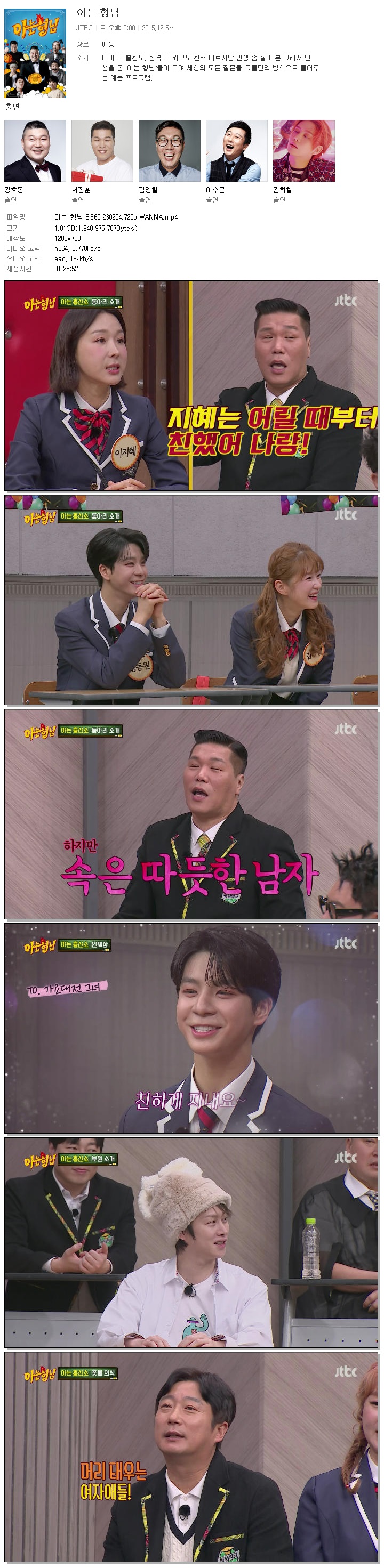 | 아는 형님.E369.230204.720p.WANNA.mp4 | 1.8 G | 01:26:52 | 1280x720 |