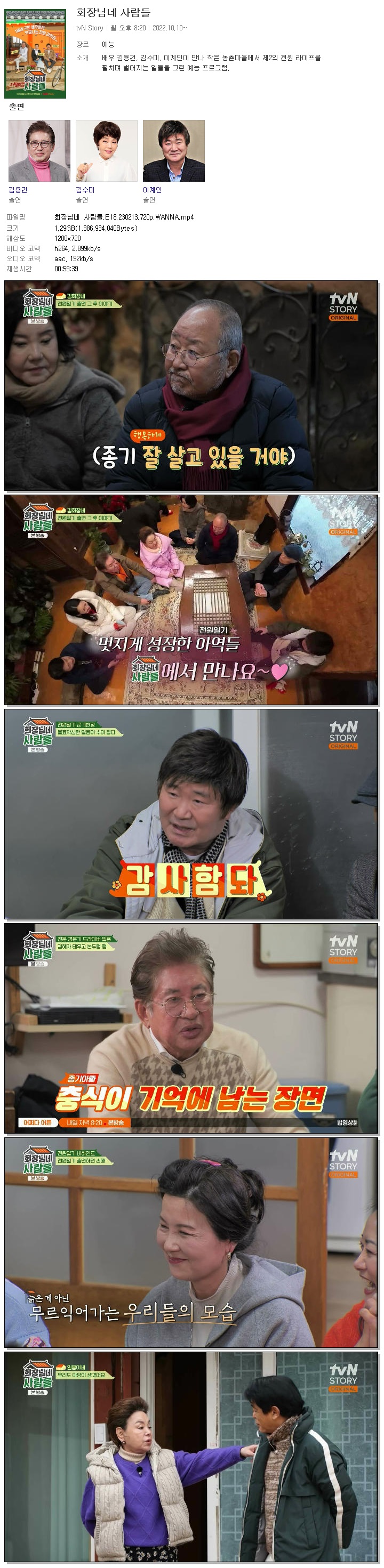 | 회장님네 사람들.E18.230213.720p.WANNA.mp4 | 1.3 G | 00:59:39 | 1280x720 |