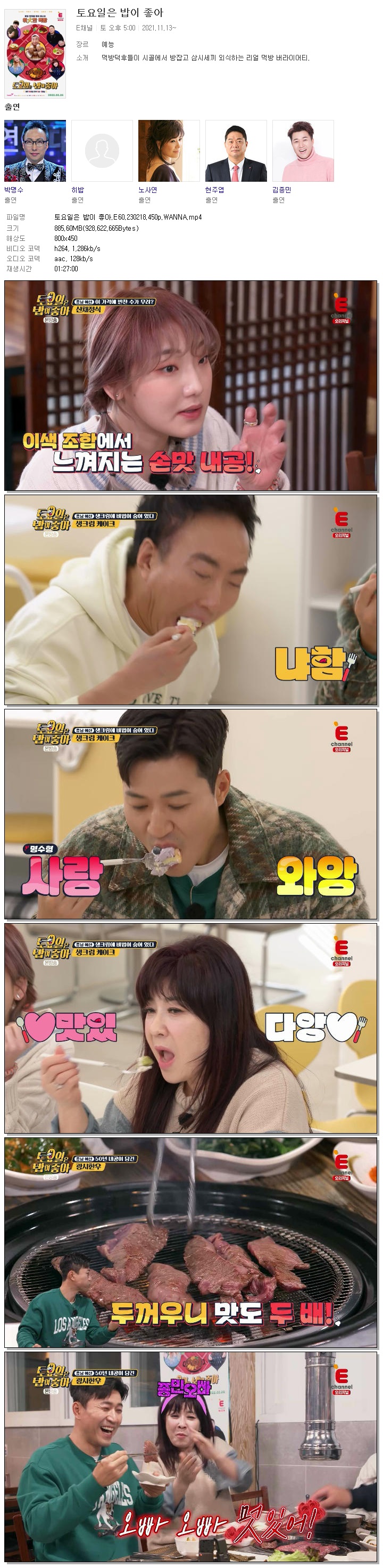 | 토요일은 밥이 좋아.E60.230218.450p.WANNA.mp4 | 885.6 M | 01:27:00 | 800x450 |