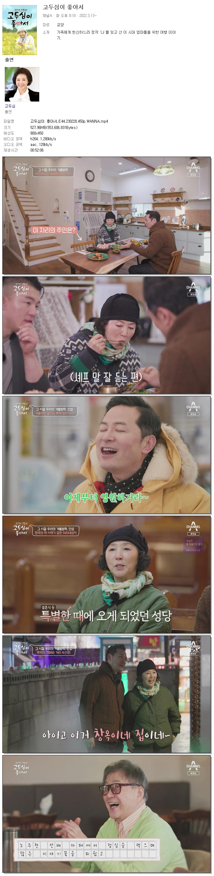| 고두심이 좋아서.E44.230228.450p.WANNA.mp4 | 528 M | 00:52:06 | 800x450 |