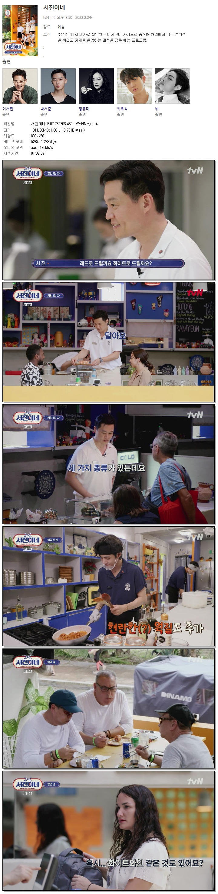 | 서진이네.E02.230303.450p.WANNA.mp4 | 1012 M | 01:39:37 | 800x450 |