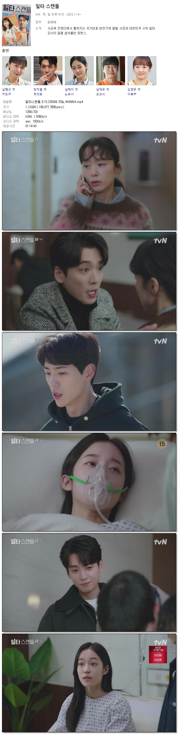 | 일타스캔들.E15.230304.720p.WANNA.mp4 | 1.1 G | 01:14:43 | 1280x720 |
