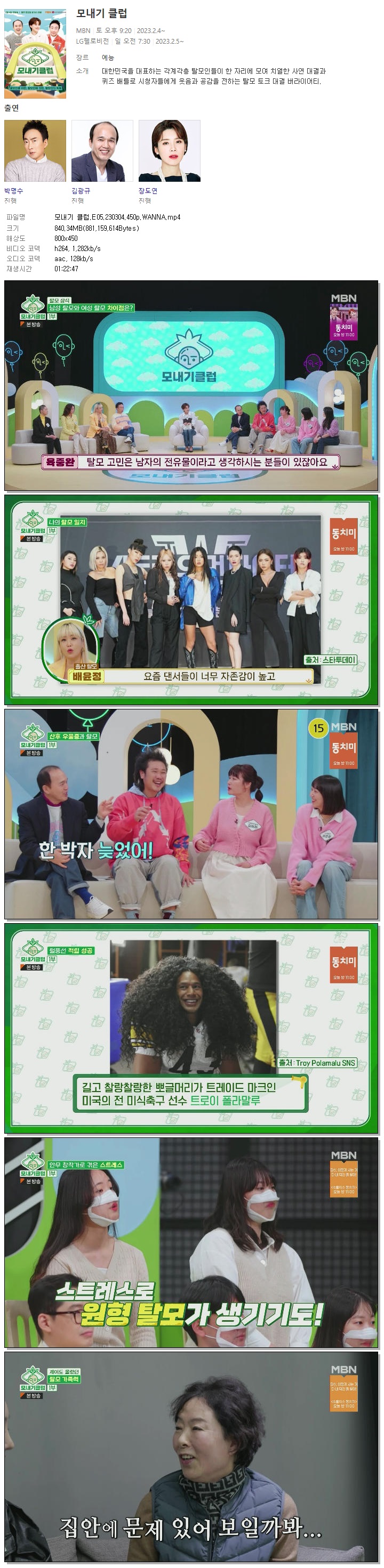 첫 여성 회원들인 ‘미모(毛) 삼총사’ 팀의 배윤정, 고은아, 제이와 ‘모(毛)블리’ 팀의 김미려, 이은형, 김가빈이 등장한다. 고은아, 김미려, 두피 디자이너 제이는 이마가 휑한 과거 사진부터 현재의 당당한 모습까지 아낌없이 공개한다. 특히 과거 학창 시절을 떠올린 고은아는 화장품 대신 4B 연필로 두피를 칠했던 경험과 직접 시도했던 충격적인 민간요법을 공개해 스튜디오를 발칵 뒤집어 놓는다. 출연진들은 ‘모내기 요정’ 유동희 의사에게 원형 탈모의 원인을 물으며 수많은 회원들에게 유익한 정보도 전달한다.