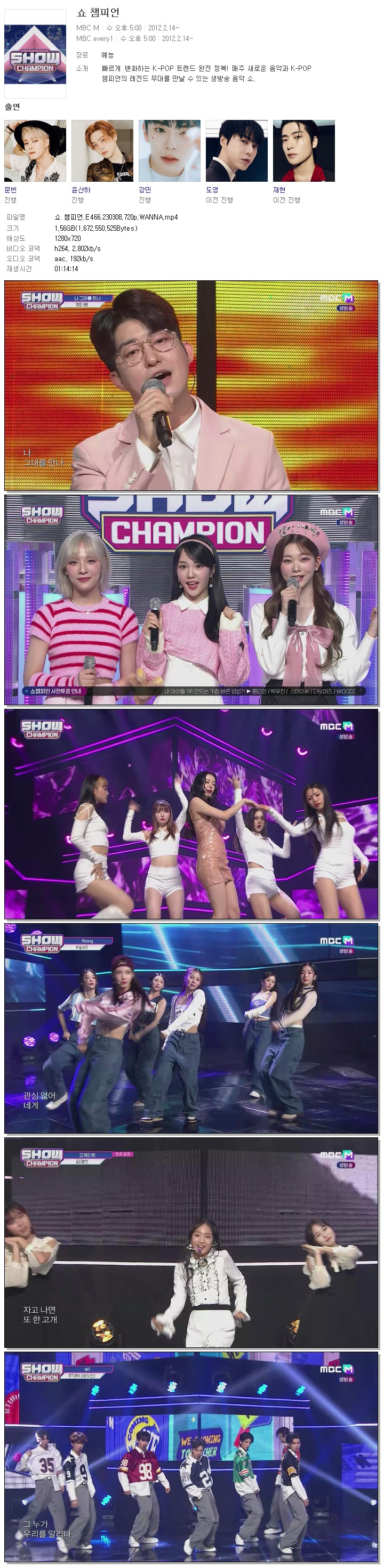 | 쇼 챔피언.E466.230308.720p.WANNA.mp4 | 1.6 G | 01:14:14 | 1280x720 |