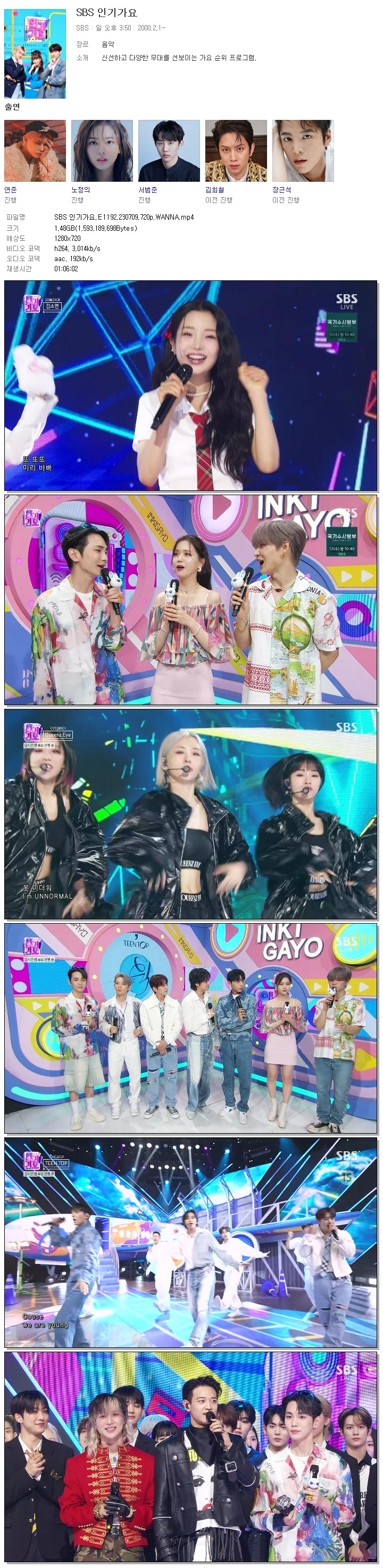 | SBS 인기가요.E1192.230709.720p.WANNA.mp4 | 1.5 G | 01:06:02 | 1280x720 |