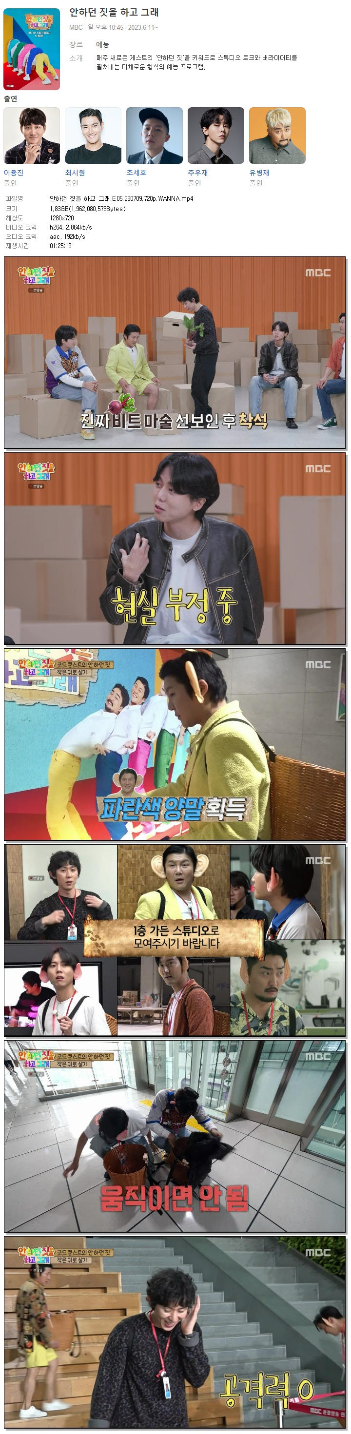 | 안하던 짓을 하고 그래.E05.230709.720p.WANNA.mp4 | 1.8 G | 01:25:19 | 1280x720 |