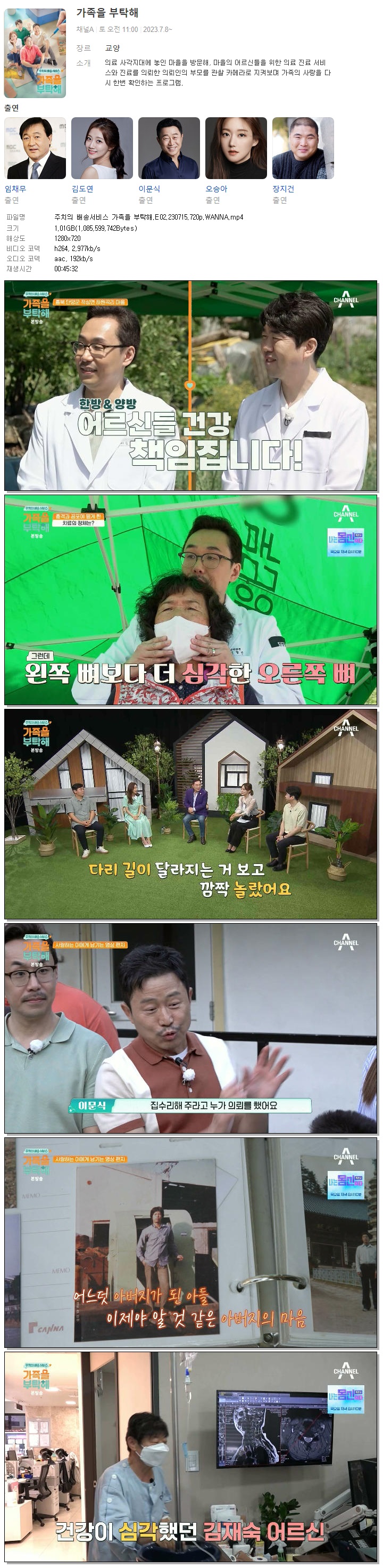 | 주치의 배송서비스 가족을 부탁해.E02.230715.720p.WANNA.mp4 | 1 G | 00:45:32 | 1280x720 |