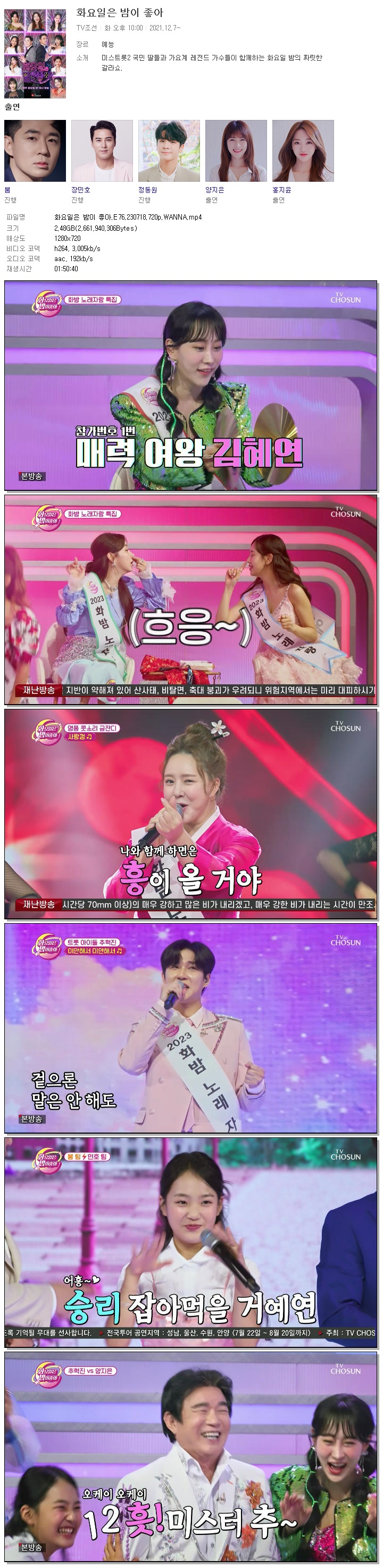 | 화요일은 밤이 좋아.E76.230718.720p.WANNA.mp4 | 2.5 G | 01:50:40 | 1280x720 |