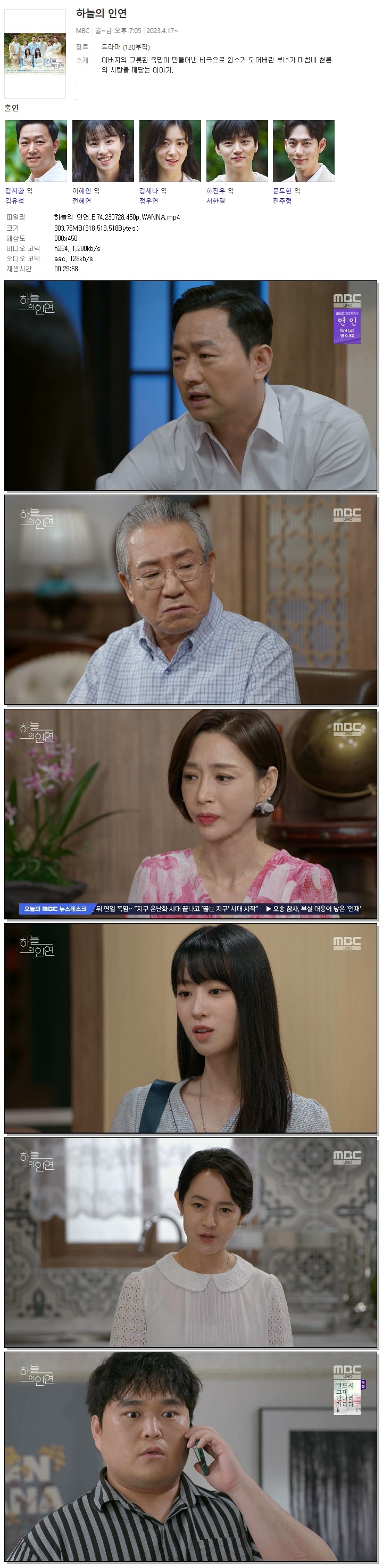 | 하늘의 인연.E74.230728.450p.WANNA.mp4 | 303.8 M | 00:29:58 | 800x450 |