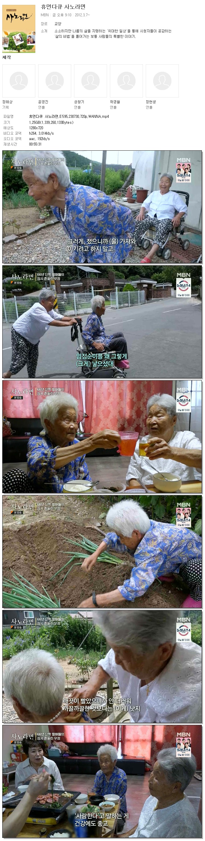 | 휴먼다큐 사노라면.E595.230730.720p.WANNA.mp4 | 1.2 G | 00:55:31 | 1280x720 |