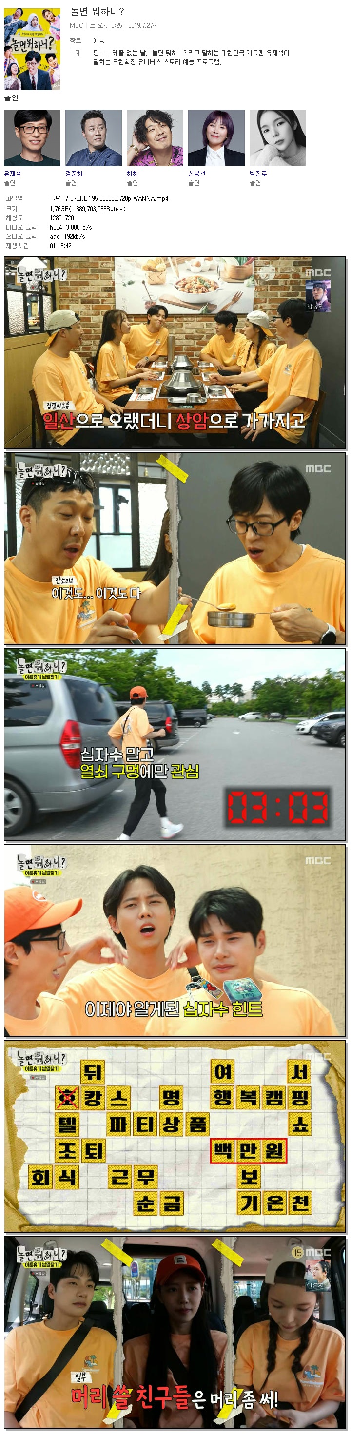 | 놀면 뭐하니.E195.230805.720p.WANNA.mp4 | 1.8 G | 01:18:42 | 1280x720 |