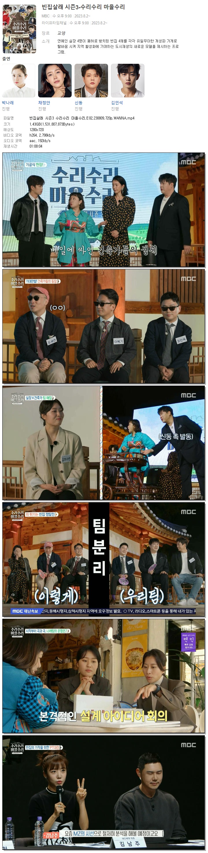 | 빈집살래 시즌3 수리수리 마을수리.E02.230809.720p.WANNA.mp4 | 1.4 G | 01:08:04 | 1280x720 |