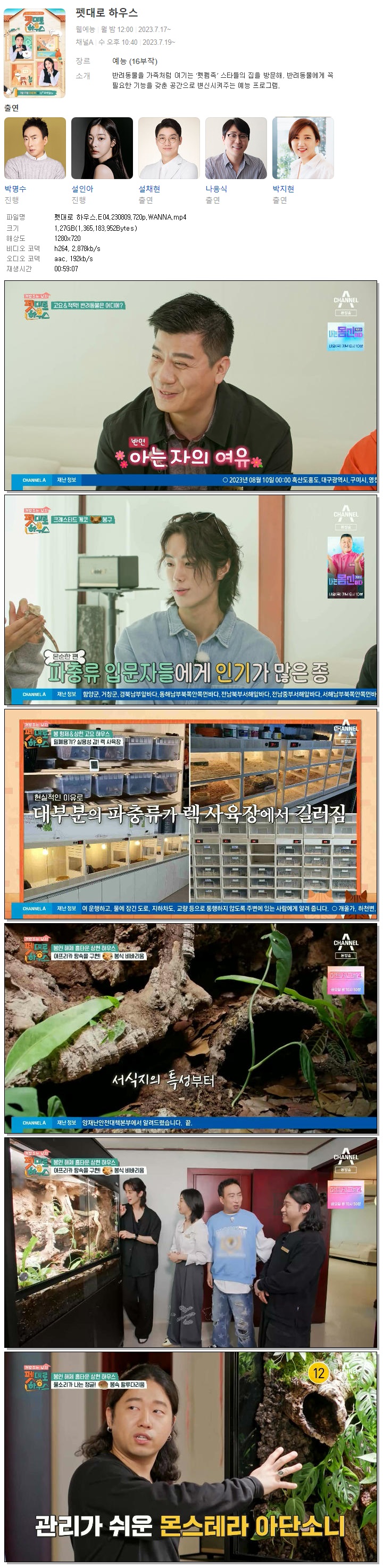 | 펫대로 하우스.E04.230809.720p.WANNA.mp4 | 1.3 G | 00:59:07 | 1280x720 |
