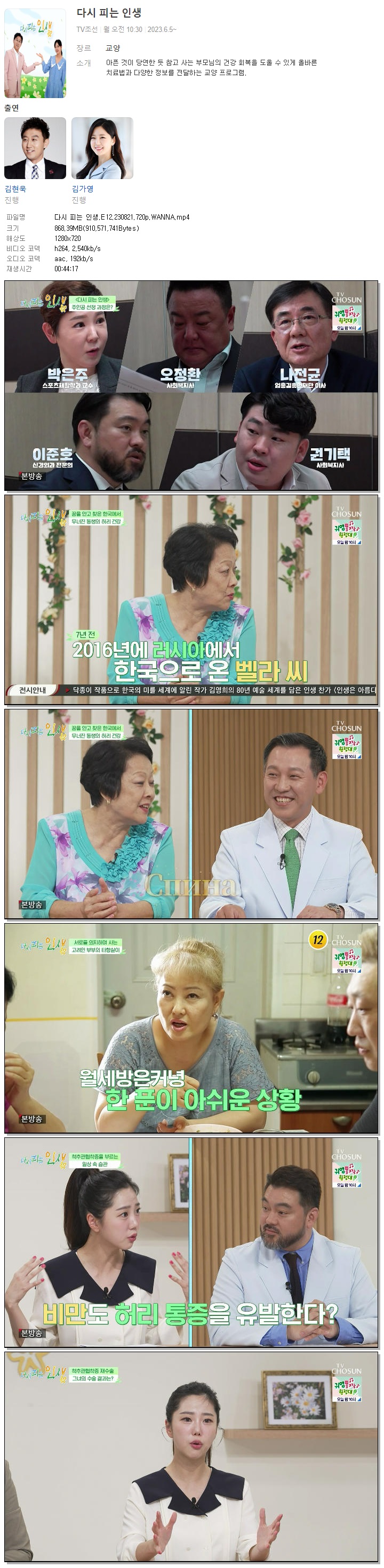 | 다시 피는 인생.E12.230821.720p.WANNA.mp4 | 868.4 M | 00:44:17 | 1280x720 |