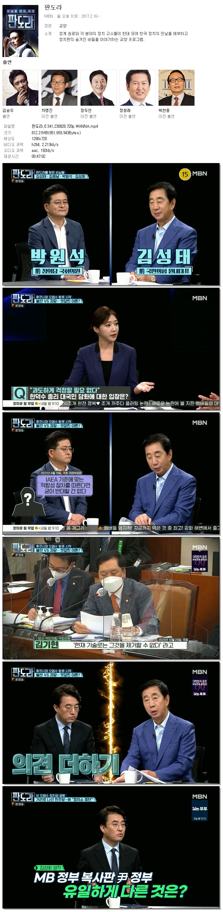 | 판도라.E341.230828.720p.WANNA.mp4 | 812.2 M | 00:47:02 | 1280x720 |