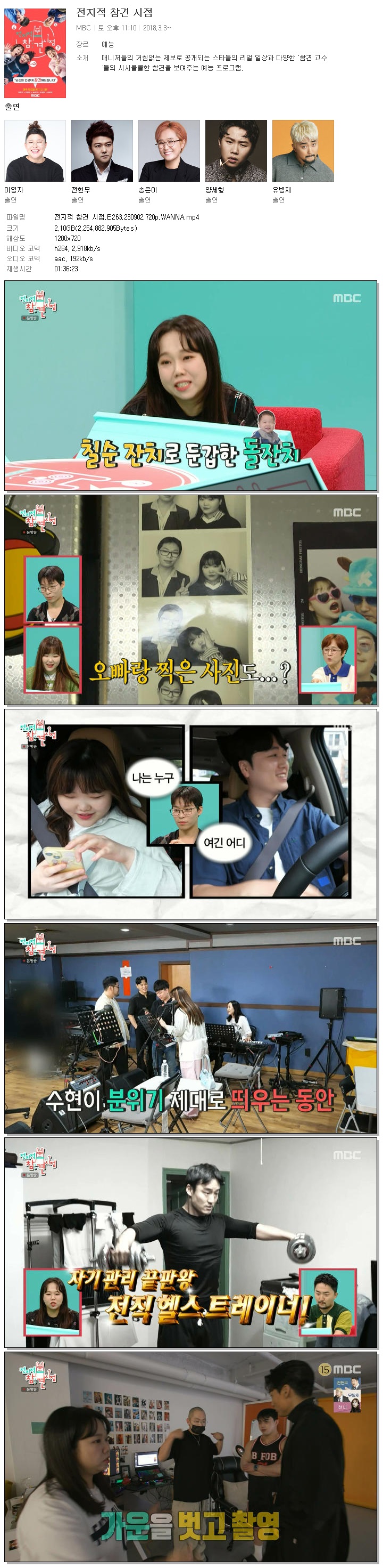 | 전지적 참견 시점.E263.230902.720p.WANNA.mp4 | 2.1 G | 01:36:23 | 1280x720 |