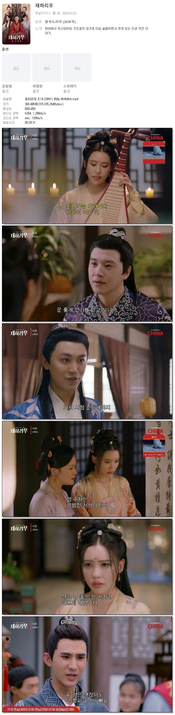 | 재하리우.E14.230911.450p.WANNA.mp4 | 300.5 M | 00:29:31 | 800x450 |
