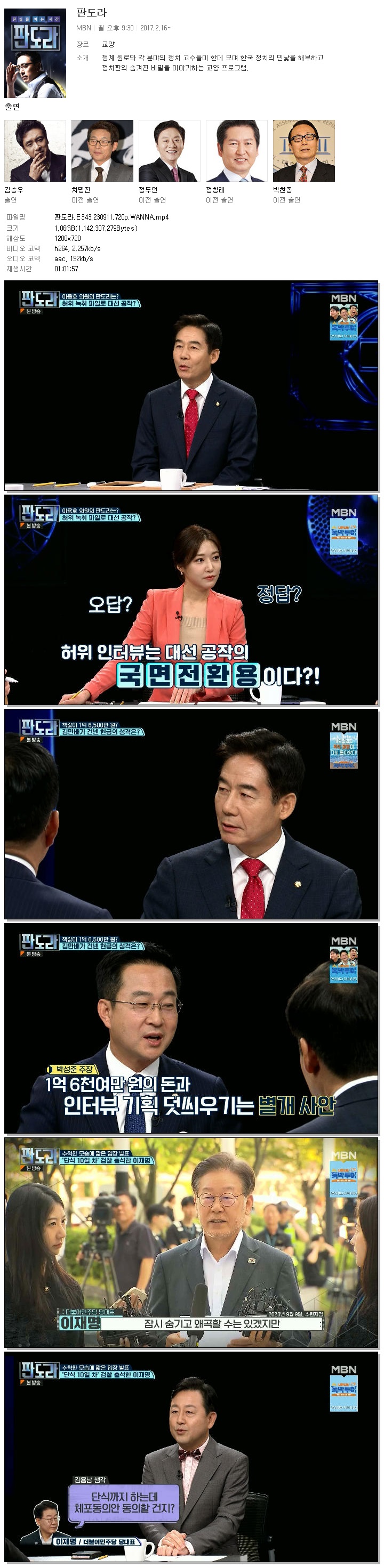 | 판도라.E343.230911.720p.WANNA.mp4 | 1.1 G | 01:01:57 | 1280x720 |