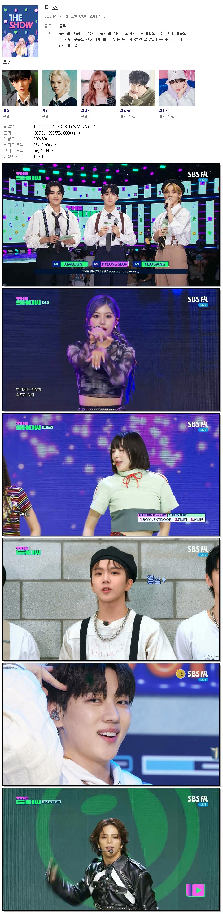 | 더 쇼.E340.230912.720p.WANNA.mp4 | 1.9 G | 01:23:10 | 1280x720 |