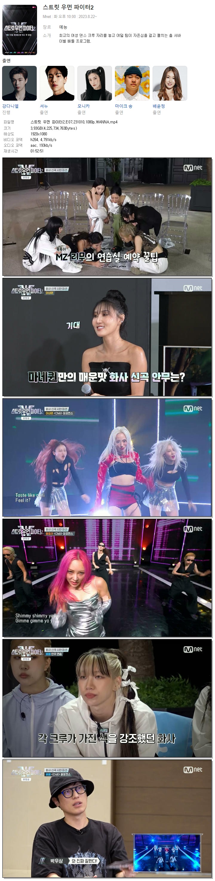 | 스트릿 우먼 파이터2.E07.231010.1080p.WANNA.mp4 | 3.9 G | 01:52:51 | 1920x1080 |