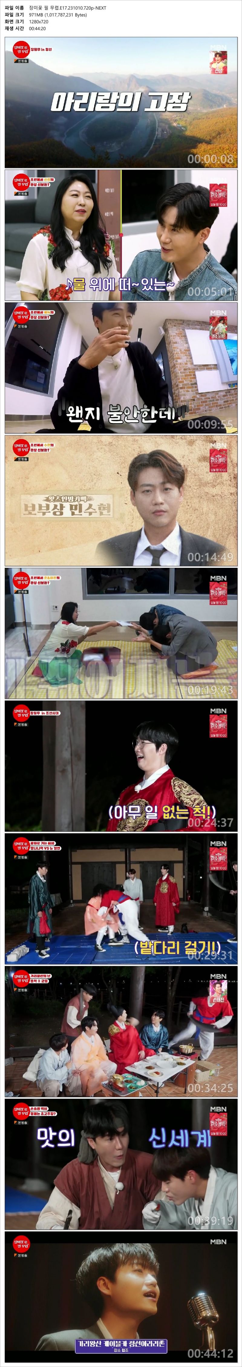 충남 서천을 방문한 ‘신에손’과 민수현, 박민수가 문헌 서원에서 서천 문화를 마음껏 즐긴다. 다섯 멤버는 자신이 직접 고른 전통 의상을 입고 포즈를 취하며 깜짝 패션쇼를 진행한다. 여장한 에녹과 민수현은 남다른 끼와 자태로 모두의 환호를 받는다. 이들은 문헌 서원을 배경으로 ′서천 열애사′ 뮤직비디오 촬영에 나선다. 문경 버스킹 마지막 미방분도 공개된다. ‘장필무’ 멤버들은 공연 중 반주가 끊기는 돌발 상황에도 침착한 태도로 무반주 열창을 펼친다.