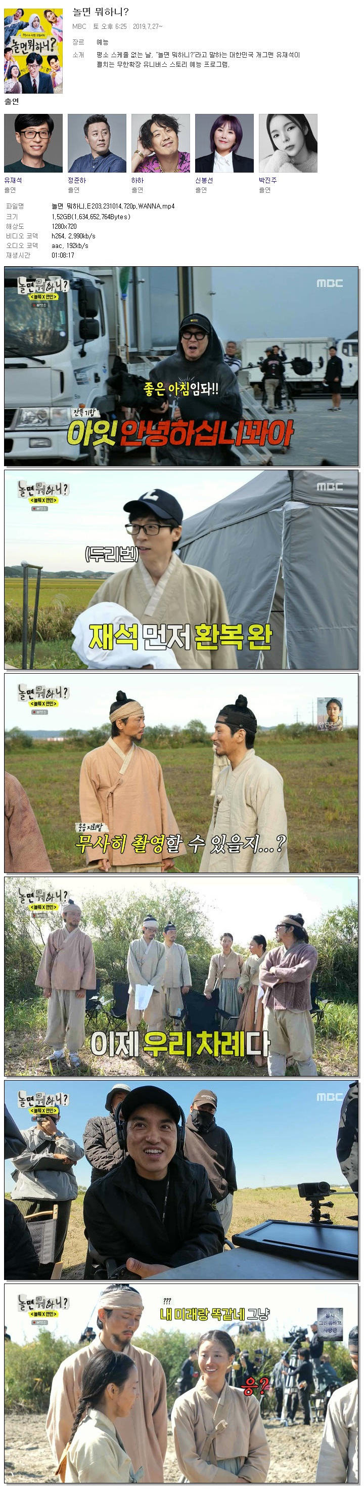 | 놀면 뭐하니.E203.231014.720p.WANNA.mp4 | 1.5 G | 01:08:17 | 1280x720 |