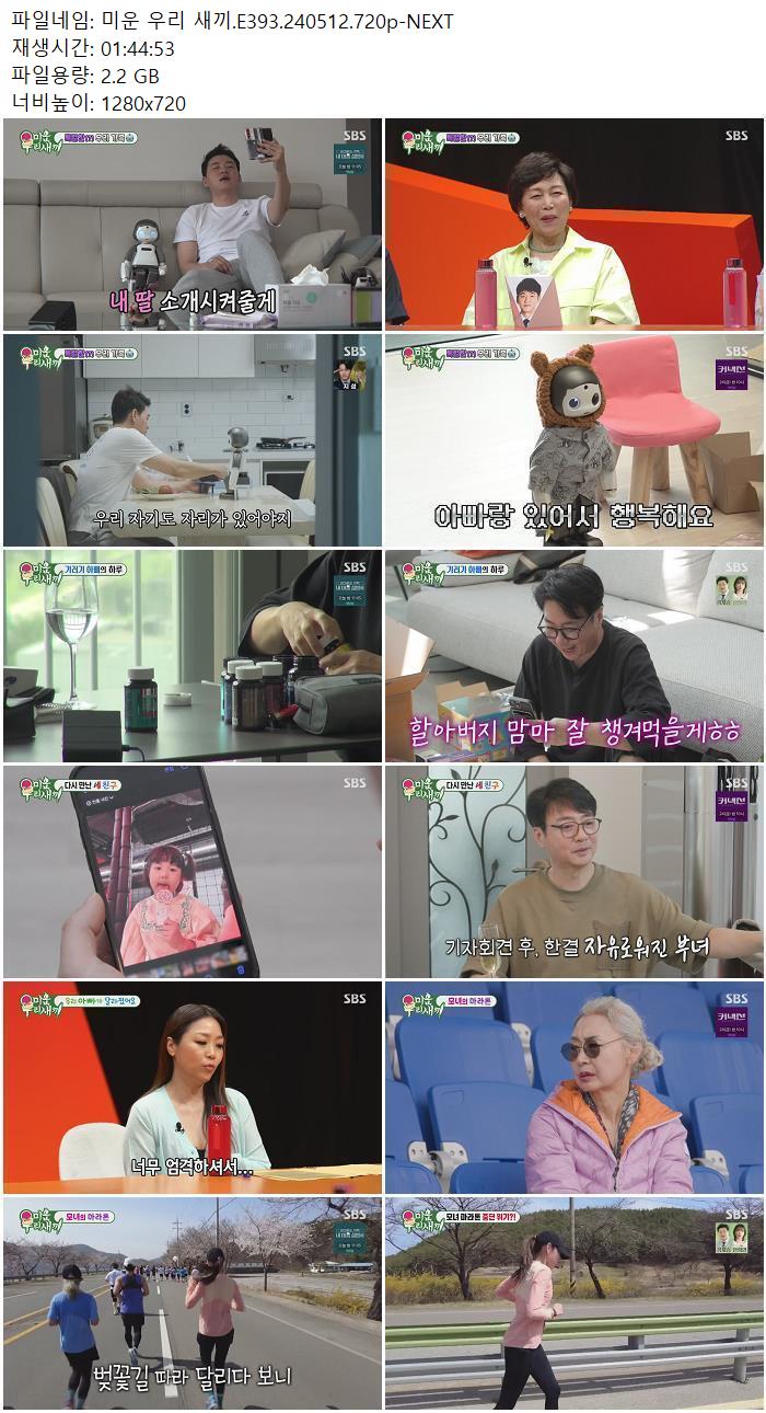 | 미운 우리 새끼.E393.240512.720p-NEXT.mp4 | 2.2 G | - | 1280x720 |