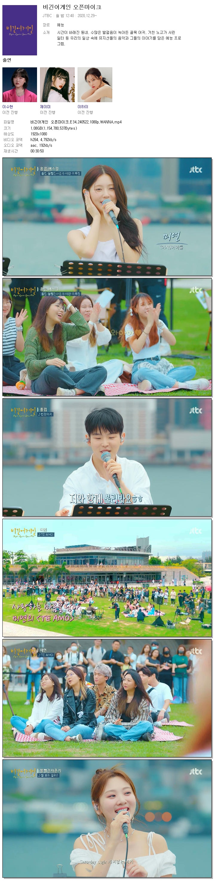 | 비긴어게인 오픈마이크.E34.240522.1080p.WANNA.mp4 | 1.1 G | 00:30:50 | 1920x1080 |