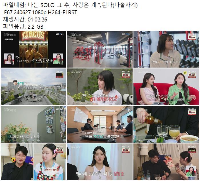 | 나는 SOLO 그 후, 사랑은 계속된다(나솔사계).E67.240627.1080p.H264-F1RST.mp4 | 2.2 G | - | 1920x1080 |
